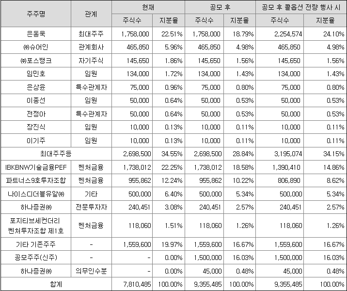 최대주주는 개인이며 총 24.1%지분율을 가지고 있습니다. 최대주주가 상장기업인 경우 공모주의 기대감에 따라 최대주주의 주가가 급격히 상승하는 경우가 있습니다 필옵틱스와 LS머티리얼즈 상장 사례에서 확인할 수 있습니다. 최대주주가 상장기업인 경우 모기업의 주가상승에서도 수익을 낼 수 있으니 잘 살펴보시기 바랍니다.