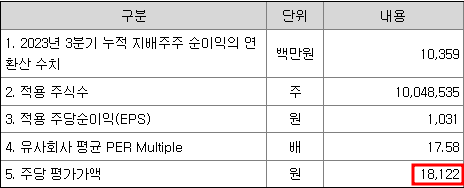 포스뱅크의 23년 3분기 누적 순이익을 연환산하면 10,359백만원이 나오는데 이를 주식수로 나누면 주당 순이이익이 1,031원입니다. 여기에 비교기업의 평균PER를 곱해 산출된 가격은 18,122원입니다.