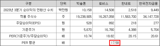 포스뱅크의 비교기업은 빅솔론, 토비스, 한네트, 한국전자금융으로 선정되었으며 이들 기업의 평균 PER은 17.58배입니다.