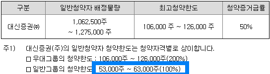 대신증권의 일반청약자의 청약한도는 53,000주 ~ 63,000주입니다. 희망공모가 상단기준 청약증거금은 159,000,000원~189,000,000원입니다.