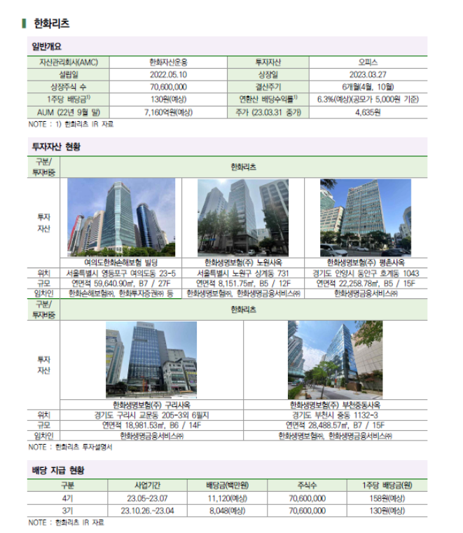 한화리츠에 대해 알아보겠습니다. 리츠의 자산현황을 살펴보고, 주가흐름과 재무상태도 확인해 보겠습니다. 설립된 4개월밖에 되지 않아 투자판단에 어려움이 있지만 적은 유통물량과 안정적인 임차인은 투자판단에 도움이 될 것입니다.