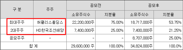 최대주주는 허큐리스홀딩스(지분율:53.75%), HD한국조선해양(지분율:21.25%)입니다. 최대주주가 상장기업인 경우 공모주의 기대감에 따라 최대주주의 주가가 급격히 상승하는 경우가 있습니다 필옵틱스와 LS머티리얼즈 상장 사례에서 확인할 수 있습니다. 최대주주가 상장기업인 경우 모기업의 주가상승에서도 수익을 낼 수 있으니 잘 살펴보시기 바랍니다.