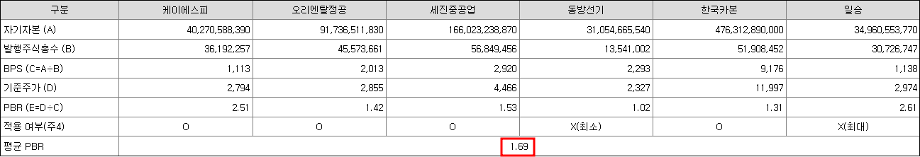 현대힘스의 비교기업은 케이에스피, 오리엔탈정공, 세진중공업, 한국카본으로 선정되었으며 이들 기업의 평균 PBR은 1.69배입니다.