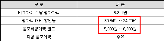 주당 평가가액에 할인율(38.84%~24.20%)을 적용해 희망공모가 5,000원 ~ 6,000원이 책정되었습니다.