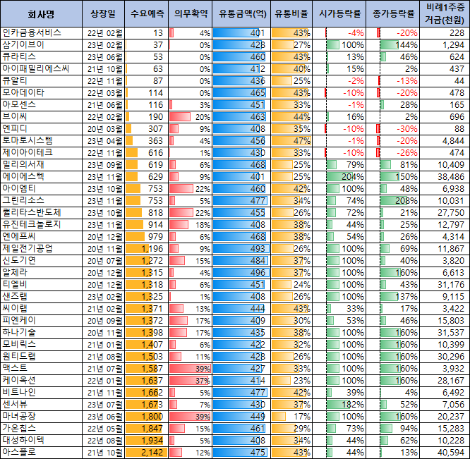 2020년부터 혐대힘스와 비슷한 유통금액(400억~500억사이)의 공모주의 상장일 성과를 살펴보면 수요예측 결과가 좋지 않은 종목은 마이너스 수익을 줬으며 수요예측 결과가 619이상인 종목은 모두 수익을 주었습니다. 현대힘스도 수요예측 결과에 따라 상장일 수익이 결정될 것 같습니다.