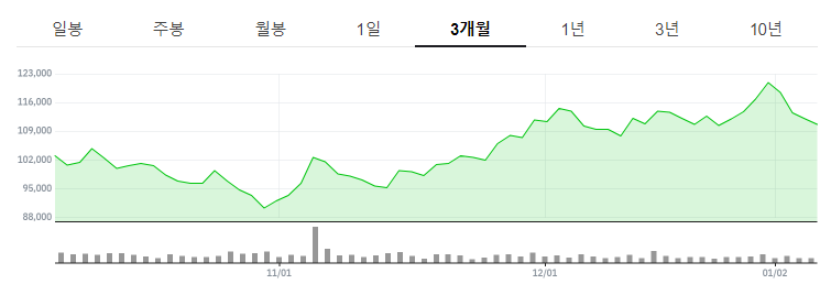 아래 그래프는 HD한국조선해양 3개월의 주가흐름입니다. 참고해보세