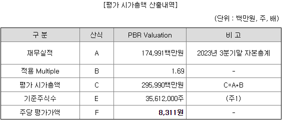 현대힘스의 23년 3분기말 자본총계는 174,991백만원이며 비교기업의 평균PBR 1.69배를 곱해 시가총액 295,990백만원을 구했으며 기준 주식수로 나눠 주당 평가가액 8,311원을 책정했습니다.