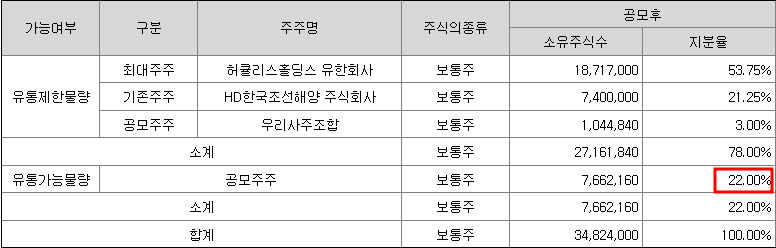 최대주주는 허큐리스홀딩스(지분율:53.75%), HD한국조선해양(지분율:21.25%)입니다. 최대주주가 상장기업인 경우 공모주의 기대감에 따라 최대주주의 주가가 급격히 상승하는 경우가 있습니다 필옵틱스와 LS머티리얼즈 상장 사례에서 확인할 수 있습니다. 최대주주가 상장기업인 경우 모기업의 주가상승에서도 수익을 낼 수 있으니 잘 살펴보시기 바랍니다.