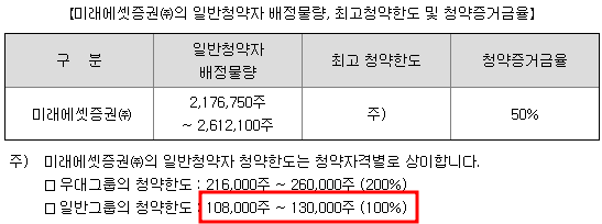 미래에셋증권의 일반고객의 청약한도는 108,000주이며 희망공모가 상단기준 증거금으로는 340백만원입니다.
