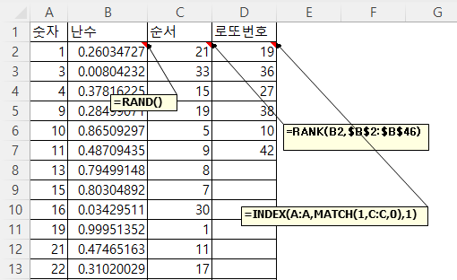 D열에서는 C열에서 낮은 순위인 A열의 숫자를 6개 불러옵니다(=INDEX와 MATCH함수 활용)